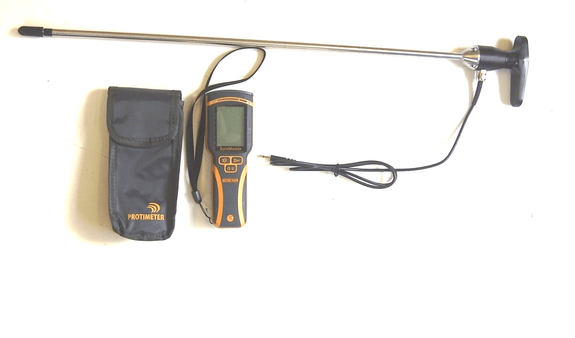 This new model consists of a hand-held unit that displays a numeric reading of the bale being tested along with a colour display ranging from green to red. The 600mm long stainless steel probe is attached by wire enabling  you to push the probe into the bale with one hand and allowing you to read the measurement displayed on the unit in the other hand.